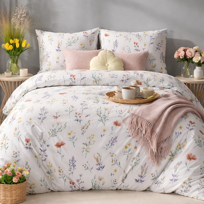 Komplet pościeli z bawełny satynowej to idealne połączenie naturalnej jakości i elegancji. Wykonany z wysokogatunkowej 100% bawełny o splocie satynowym, zapewnia niezrównany komfort snu i delikatność w dotyku. Subtelny wzór w kwiaty na łące nadaje pościeli wyjątkowy urok, który sprawdzi się w każdej sypialni – od stylu skandynawskiego po glamour.